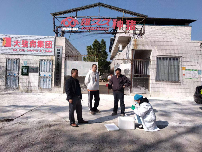 为了切实做好冬春季节非洲猪瘟监测预警和防控工作,根据《自治区农业农村厅关于印发应对境外非洲猪瘟疫情输入风险全力做好全区疫情防控工作方案的通知》(桂农厅发〔2023〕89号)、《广西壮族自治区动物疫病预防控制中心关于印发全区非洲猪瘟专项监测和疫情排查工作方案的通知》(桂疫控〔2023〕72号)要求,11月28日梧州市动物疫病预防控制中心到长洲区开展非洲猪瘟专项监测排查工作,重点排查养殖环节及屠宰环节非洲猪瘟防控落实情况并随机抽取2个养殖场及1个屠宰场样品进行非洲猪瘟监测。