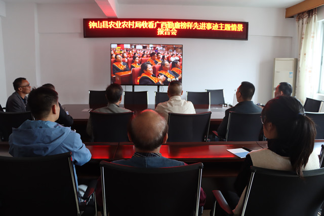 11月29日,钟山县农业农村局组织农业干部集中收看广西勤廉榜样先进事迹主题情景报告会实况录像,出差在外、未能参加集中收看的农业干部自觉通过电视、网络等多种方式收看或补看。