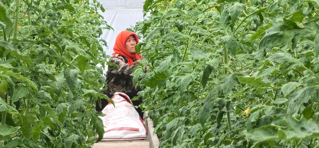 在寿光市田柳镇的现代农业创新创业示范园区大棚内,菜农正在劳作。新华社记者叶婧摄