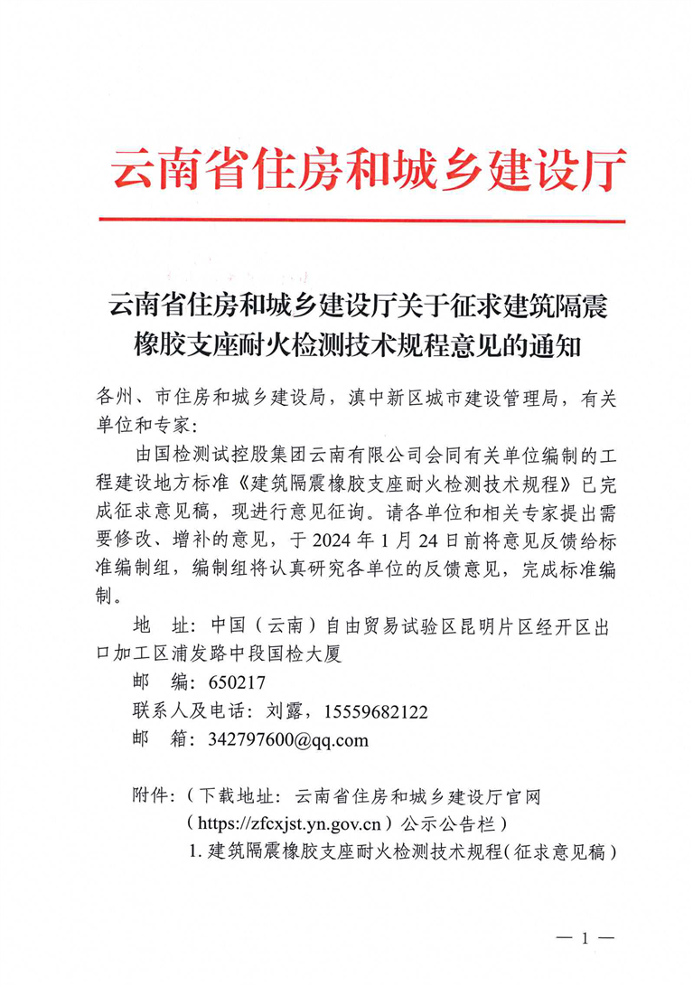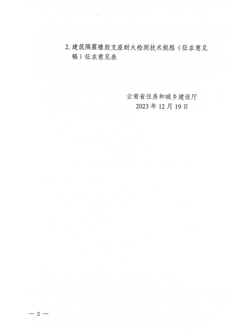 云南省住房和城乡建设厅关于征求建筑隔震橡胶支座耐火检测技术规程意见的通知