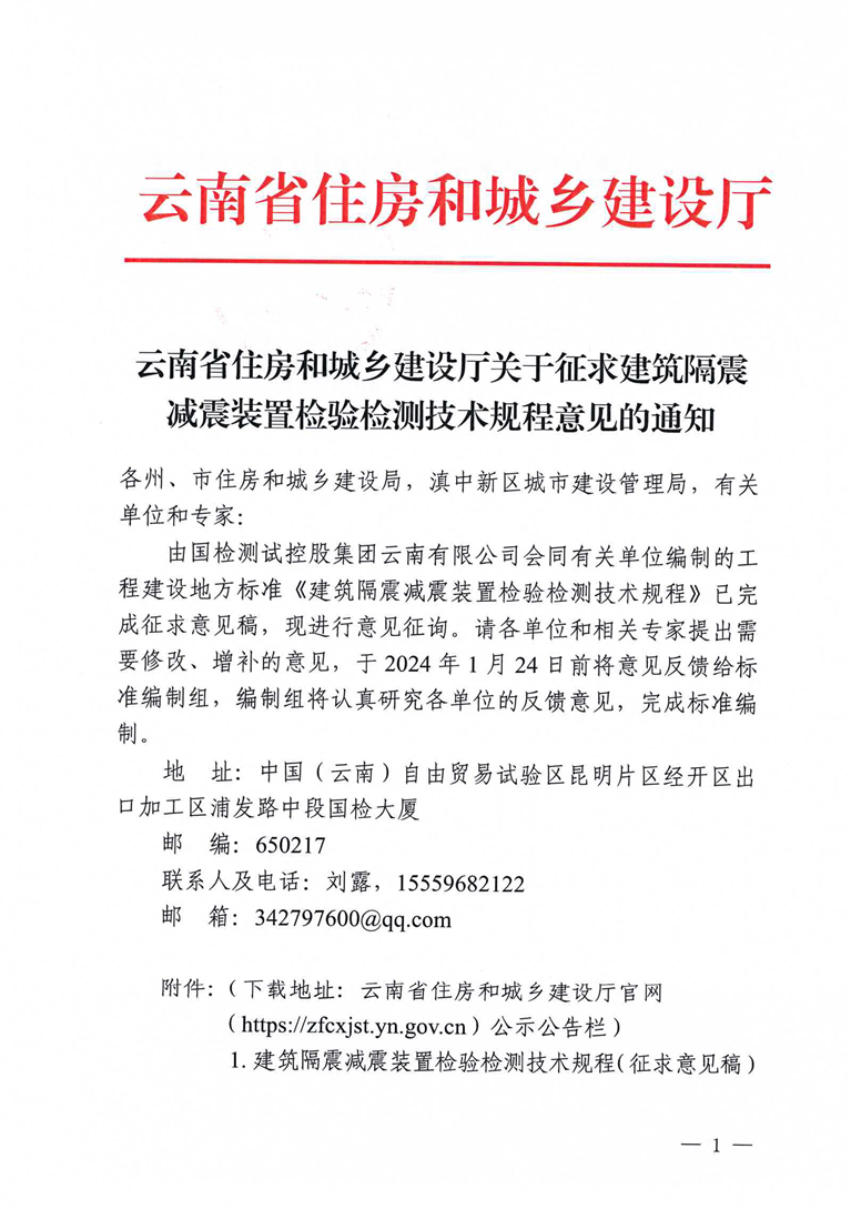 云南省住房和城乡建设厅关于征求建筑隔震减震装置检验检测技术规程意见的通知