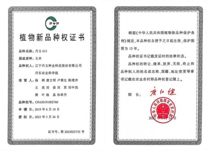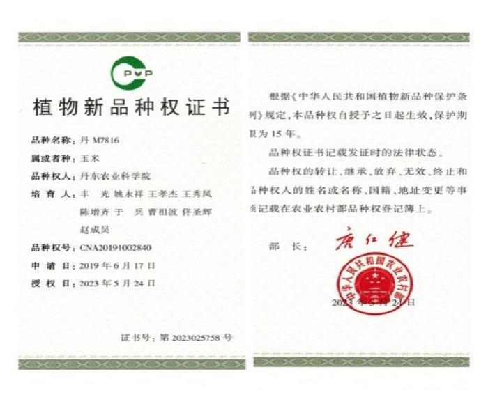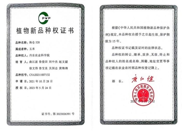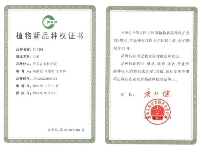 2023年12月,丹东农科院本年度玉米科研工作已进入阶段性总结阶段,玉米研究所在科研成果保护方面取得了新进展,四项玉米科研成果完成植物新品种保护程序,正式获得农业部颁发的《植物新品种权证书》,分别是玉米杂交种海仓528、丹玉615、丹3201和玉米自交系丹M7816。