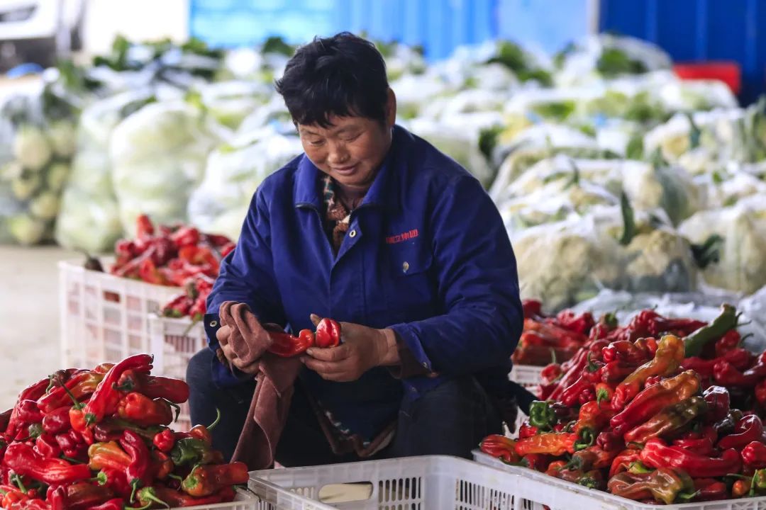 在基地工棚处,刚采收的辣椒、黄瓜、菜薹、小白菜、西兰花等蔬菜被装进一个个大塑料袋,正准备按订单发往园区企业、农贸市场。