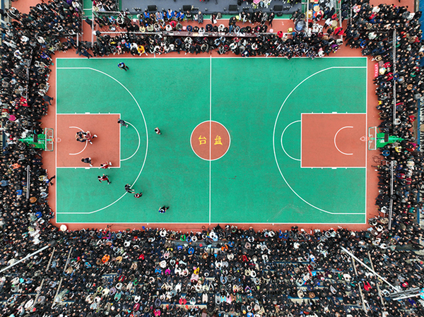 这是2023年3月27日在贵州省黔东南州台江县台盘村拍摄的贵州省首届“美丽乡村”篮球联赛总决赛比赛现场(无人机照片)。新华社记者 欧东衢 摄