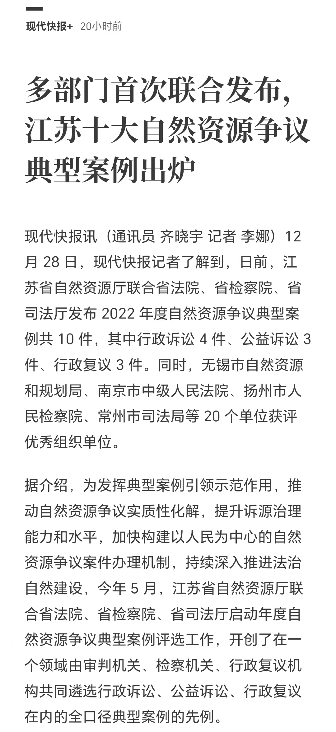 今年,为深入贯彻落实习近平法治思想和习近平生态文明思想,发挥典型案例引领示范作用,推动自然资源争议实质性化解,提升诉源治理能力和水平,加快构建以人民为中心的自然资源争议案件办理机制,持续深入推进“法治自然”建设,今年5月,省厅与省高级人民法院、省人民检察院、省司法厅首次联合启动自然资源争议典型案例评选工作。