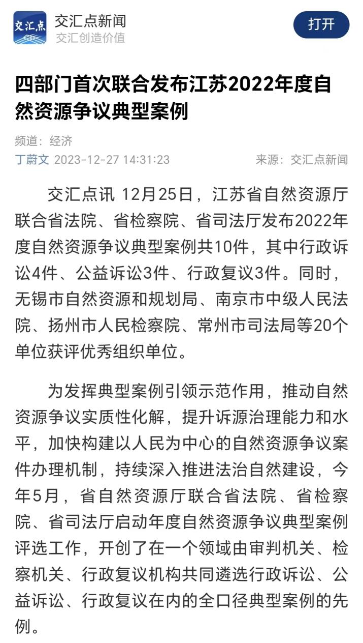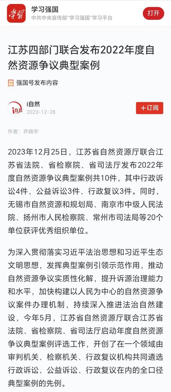 自然资源部法规司司长魏莉华指出,“江苏厅联合省高院、检察院、司法厅围绕自然资源争议开展典型案例评选,积极回应了《行政复议法》等法律修改带来的新挑战,既遴选出了能为相关法律空白区或者有争议类案提供借鉴的优秀案例,又建立了高效顺畅的沟通协调机制,书写了制度化开展自然资源典型案例评选的序章,是深入推进‘法治自然’建设的有益探索。这一回,江苏又走在了全系统前列。”