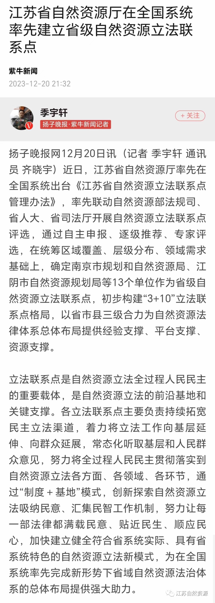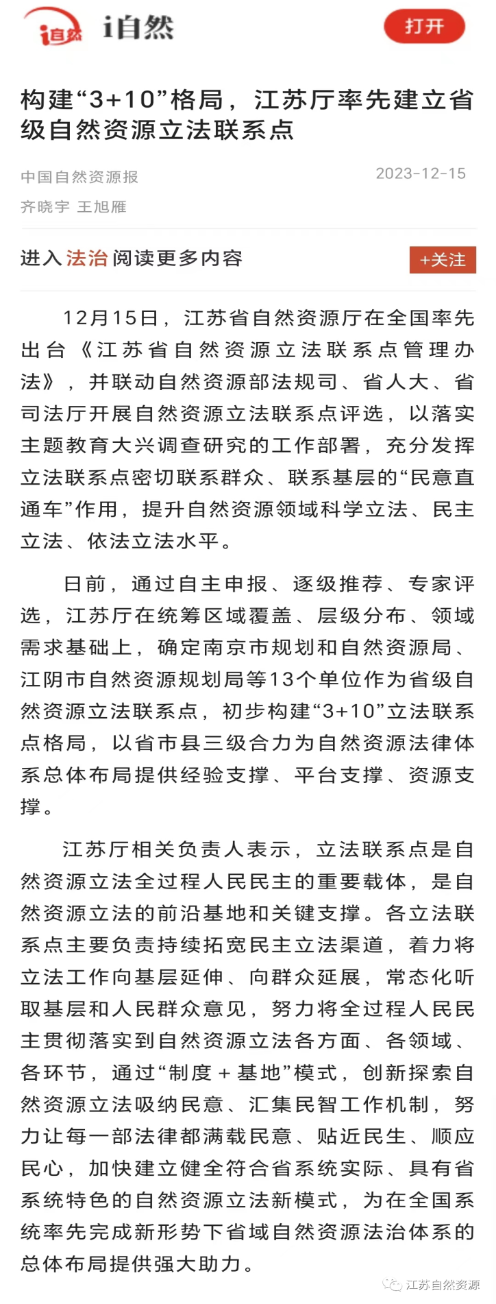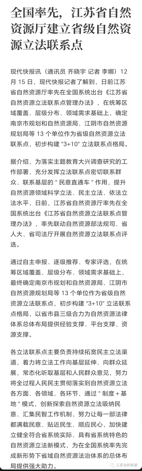 日前,我厅率先在全国系统出台《江苏省自然资源立法联系点管理办法》,确定南京市局、江阴市局等13个单位作为省级自然资源立法联系点,初步构建 "3+10" 立法联系点格局。《中国自然资源报》头版、i自然全媒体、交汇点、现代快报、紫牛新闻(扬子晚报)等多家媒体跟进报道。