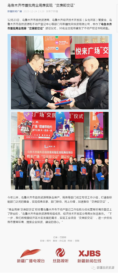 12月23日,乌鲁木齐市自然资源局、乌鲁木齐经济技术开发区(头屯河区)管委会、乌鲁木齐市自然资源和不动产登记中心等部门与新疆悦来投资有限公司,举办了乌鲁木齐市首批商业用房“交房即交证”颁证仪式,30名业主现场拿到了不动产权证书和钥匙。