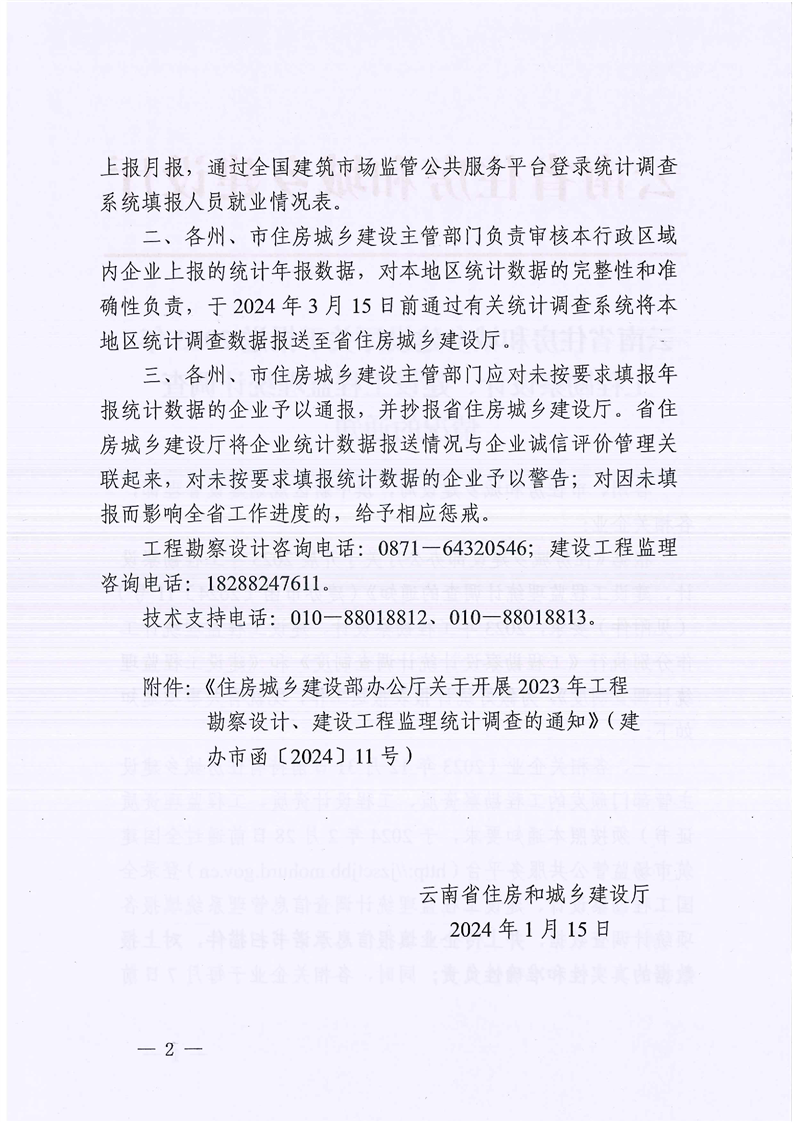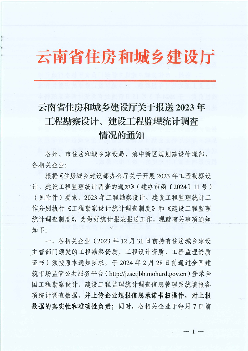 云南省住房和城乡建设厅关于报送2023年工程勘察设计、建设工程监理统计调查情况的通知