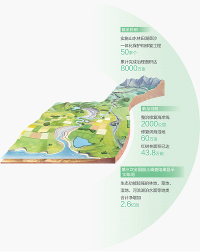 自然资源部积极推进山水林田湖草沙一体化保护和修复工程、历史遗留废弃矿山生态修复示范工程和海洋生态保护修复项目,筑牢国家生态安全屏障。鼓励和支持社会资本参与生态保护修复,引导政策性金融投入资金3500亿元。截至目前,我国已部署实施山水林田湖草沙一体化保护和修复工程50多个,累计完成治理面积达8000万亩。