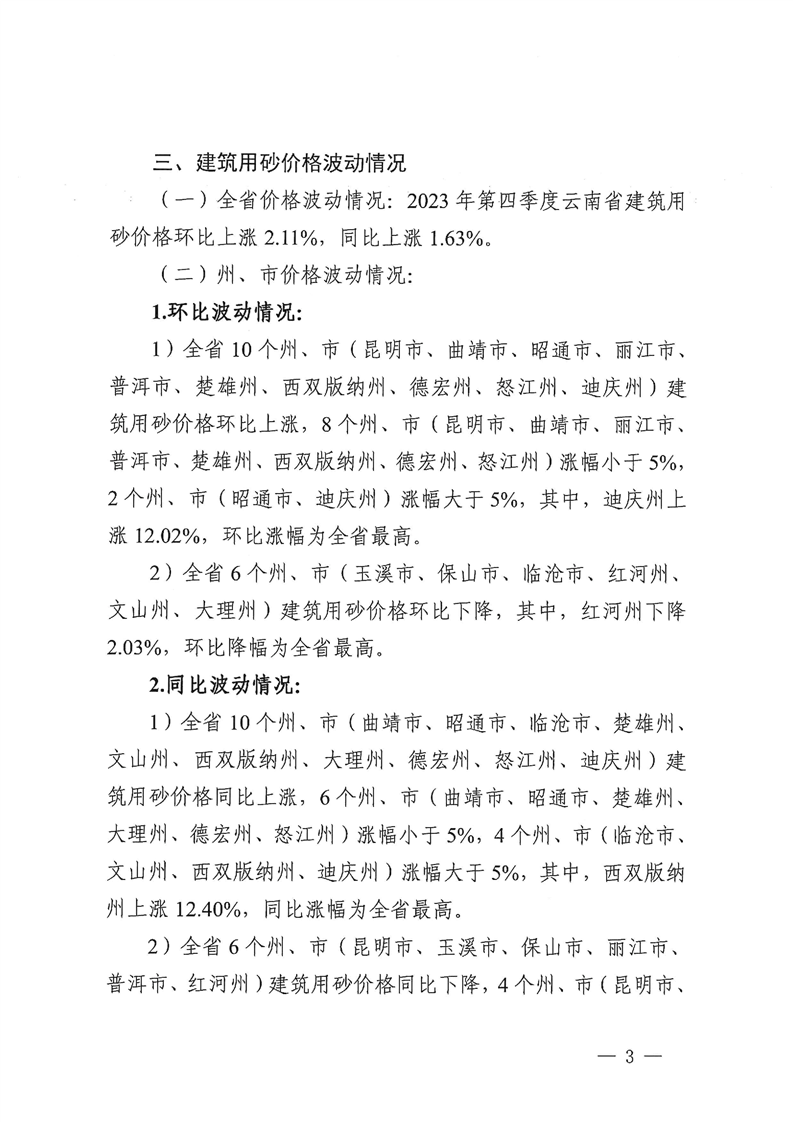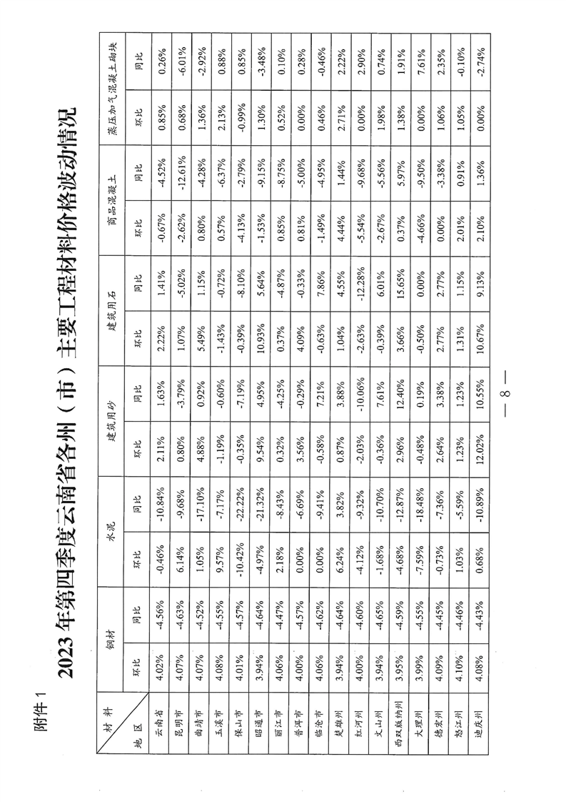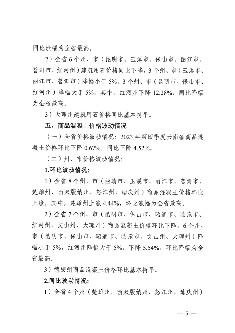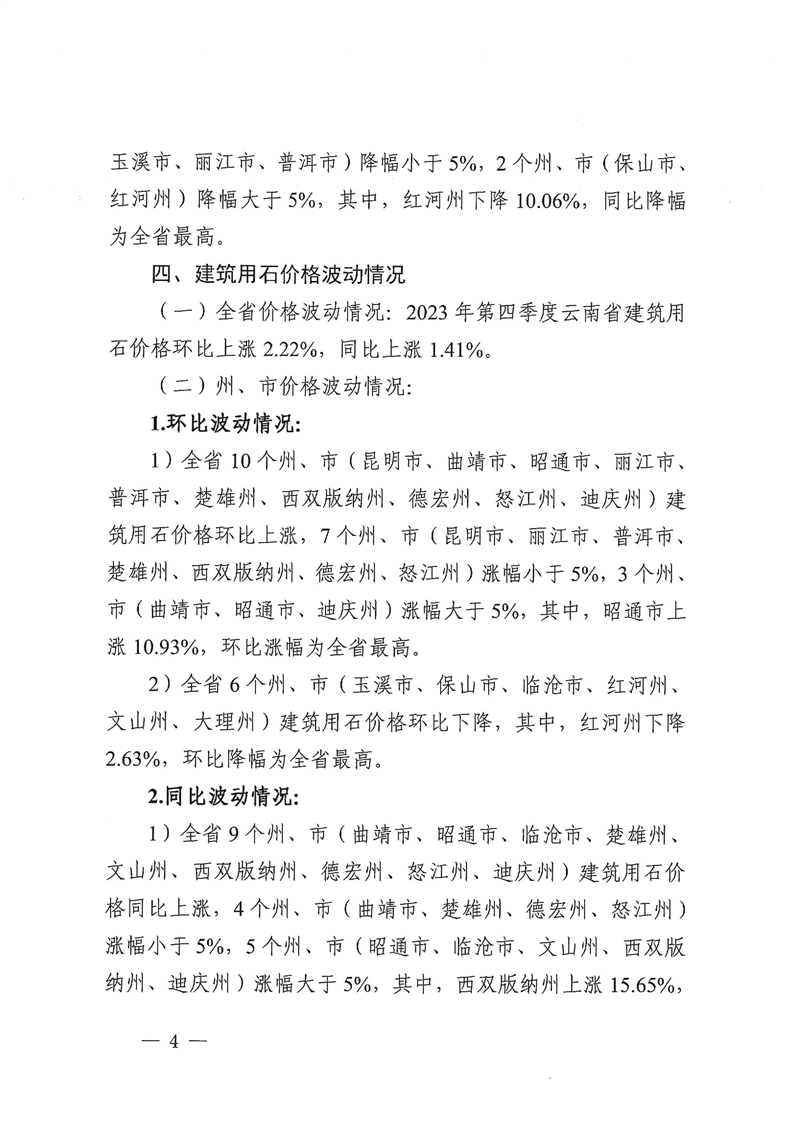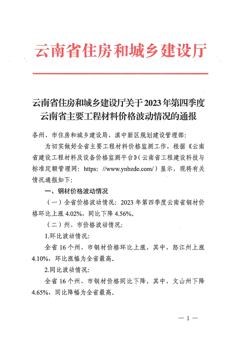 云南省住房和城乡建设厅关于2023年第四季度云南省主要工程材料价格波动情况的通报