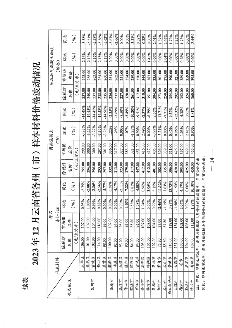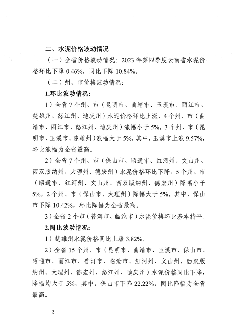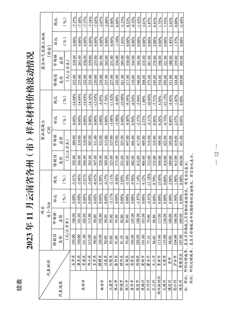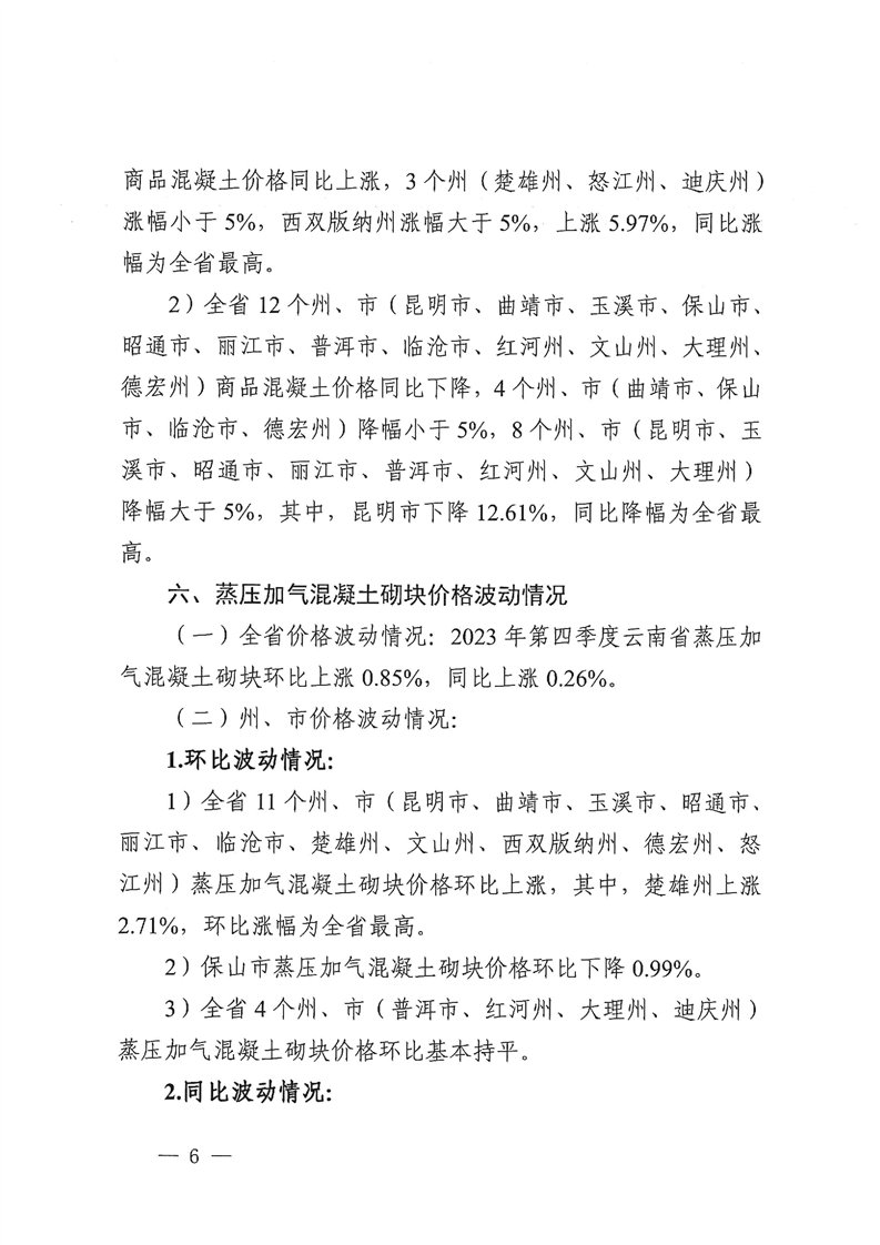 云南省住房和城乡建设厅关于2023年第四季度云南省主要工程材料价格波动情况的通报