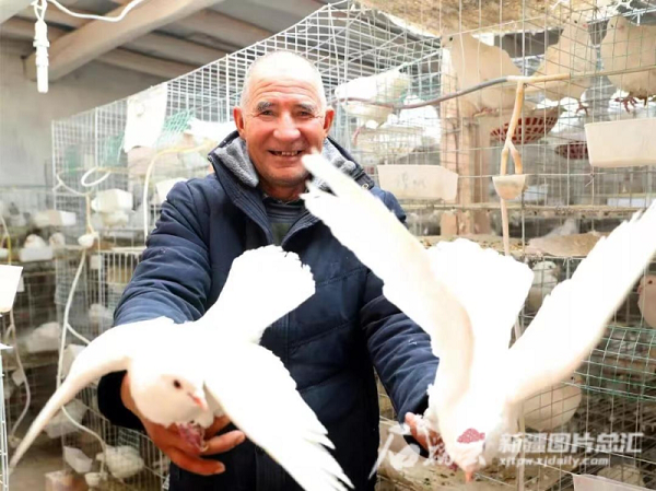 喀什新投鸽业合作养殖户,喀什市英吾斯坦乡英喀什村村民塔什·依米提展示自家养殖的肉鸽。热依丁·苏来曼摄