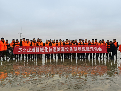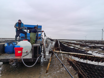 会议介绍了设备研发和试点情况,现场演示快速除藻全过程。该设备以现有的滩涂养殖拖拉机为载体,加载喷药除藻装置,拖拉机经过时可抬高养殖竹竿和缆绳、自动喷淋除藻剂、并回收掉落药液循环利用。从演示情况看,设备操作简便,每小时可除藻8台筏架,是人工除藻效率的20倍。目前,省厅已将设备配备到浒苔防控区每家紫菜养殖企业。下一步,将指导地方督促养殖企业用好机械化快速除藻设备,切实提升除藻效率,减少绿藻附着和掉落。