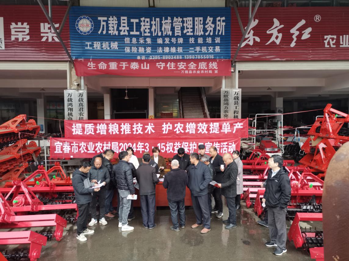 阳春3月是春耕备耕时节,正处于各类农机具使用高峰和产销旺季, 3月15日,以“提质增粮推技术护农增效提单产”为主题的2024年宜春市“农机3·15”消费者权益日活动在万载县农机大市场举行,依法维护农机消费者的合法权益,为春耕备耕有序进行保驾护航。