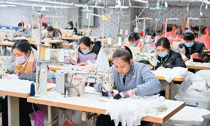 近日,在合浦县廉州镇一家制衣企业生产车间,工人正在赶制订单产品。近年来,该县引导各企业吸纳脱贫人口就业,推动农民收入稳定增长。林启波 摄