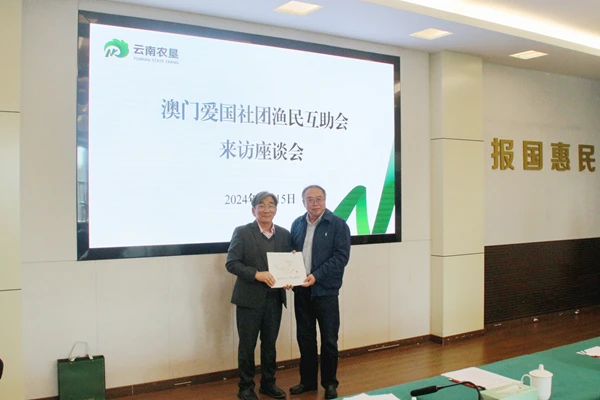 3月15日,澳门中联办社会工作部李宇钒、澳门渔民互助会理事长陈明金率队的澳门爱国社团渔民互助会代表团一行访问云南。省农业农村厅总经济师潘文斌参加考察调研,云南农垦集团集团副总经理吴忠红参加座谈交流。
