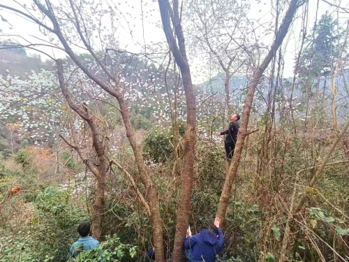 3月的布甲野生樱花正处于盛花期,上万亩野生樱花在山间肆意绽放,美不胜收。团队成员在当地向导的带领下,翻越山岭,钻进密林,蹚过溪流,深入布甲乡野生樱花分布中心区域。经过实地调查,发现该区域野生樱花分布面积大,主要是以山樱花和迎春樱桃两个种为主,同种不同单株的花器官也存在较大的差异,部分单株表现出较优异的观赏特点,具有较强的研究和挖掘利用价值。
