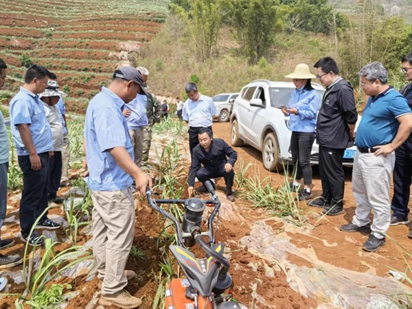 在中课镇甘蔗种植基地,调研组实地查看了蔗苗生长情况,向企业了解甘蔗加工、销售情况以及“坡改台”土地提质增效存在的困难,鼓励企业在小型农机应用上大胆创新。