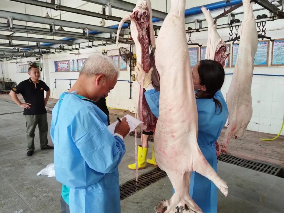 为了更全面掌握文昌猪这一地方特色遗传资源生产性能状况,2024年3月22日,省畜牧技术推广总站联合文昌市畜牧兽医服务中心、抢救性保护专家组、省地方猪产业技术体系有关专家及其团队,在文昌市文城屠宰场开展了文昌猪屠宰及肉质性能测定工作。当天上午,专家们早早来到屠宰场,提前准备屠宰及测定场地、测定设备、采样工具等,并按照“宰前空腹称重→屠宰→胴体劈半、称重→留左胴体悬挂→测直长、皮厚、背膘厚→取肉质样品→测眼肌面积→测pH值→肉样切块分样”的流程,安排落实人员分工,确保测定工作有序开展。本次测定有利于进一步完善文昌猪生产性能测定数据和更好地开展种质特征特性评估,为下一步开发利用工作提供参考。