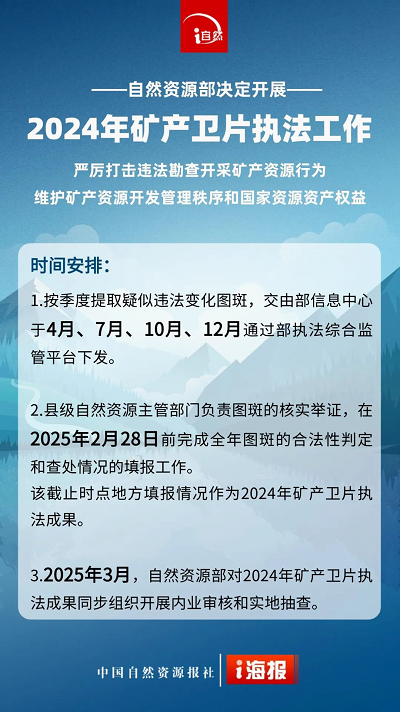 为认真履行自然资源管理“两统一”职责,严厉打击违法勘查开采矿产资源行为,维护矿产资源开发管理秩序和国家资源资产权益,保护生态环境,助力高质量发展,部决定开展2024年矿产卫片执法工作。现将有关事项通知如下。