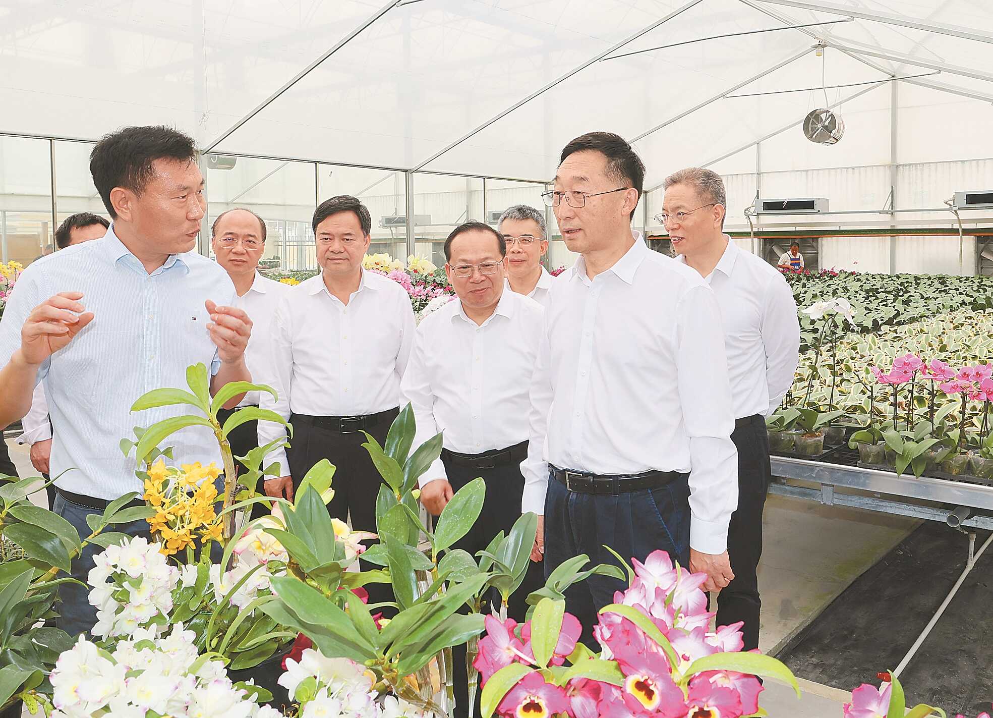 3月27日,自治区党委书记刘宁在南宁市上林县调研。来到粤桂协作(上林)花卉产业示范园,刘宁实地察看兰花种植、花卉全产业链建设情况,听取现代特色农业产业发展、乡村振兴工作有关情况汇报。黄克 摄