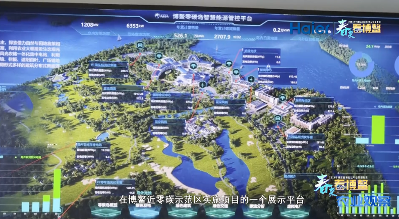 国能(海南)新能源发展有限公司博鳌光伏电站 站长 闫亮 这里呢是我们国家能源集团在博鳌近零碳示范区实施项目的一个展示平台,通过这个平台,可以实时地观看到岛内及岛外所有项目的运行情况。