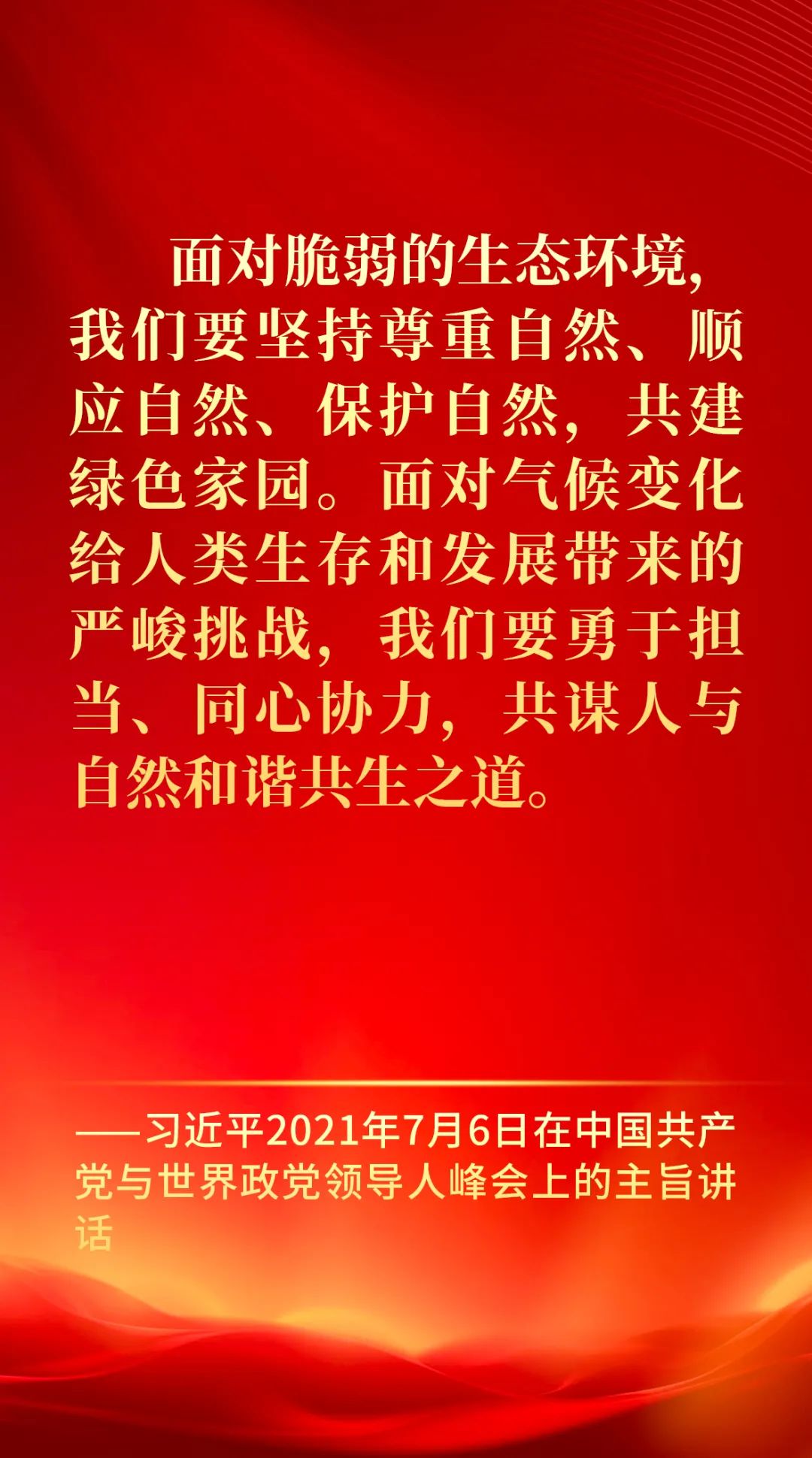 面对脆弱的生态环境,我们要坚持尊重自然、顺应自然、保护自然,共建绿色家园。面对气候变化给人类生存和发展带来的严峻挑战,我们要勇于担当、同心协力,共谋人与自然和谐共生之道。