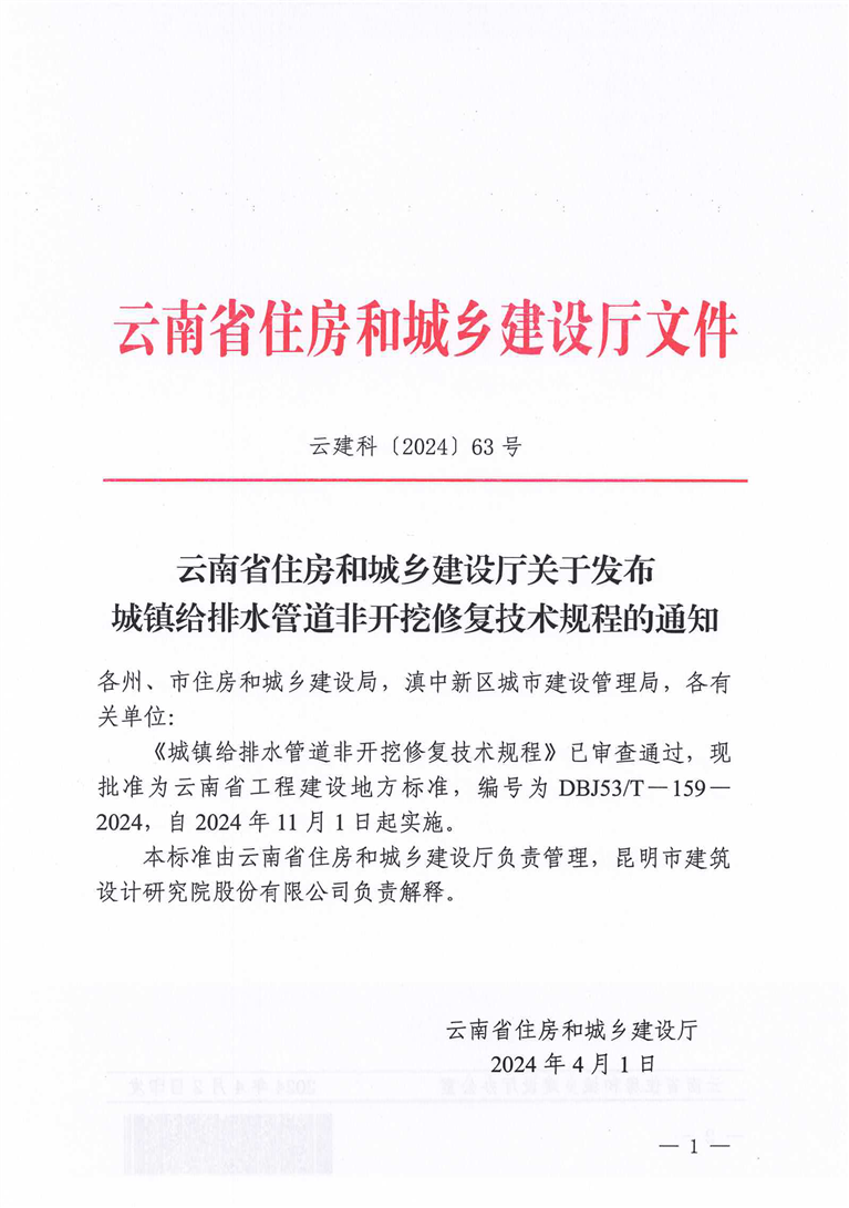 云南省住房和城乡建设厅关于发布城镇给排水管道非开挖修复技术规程的通知