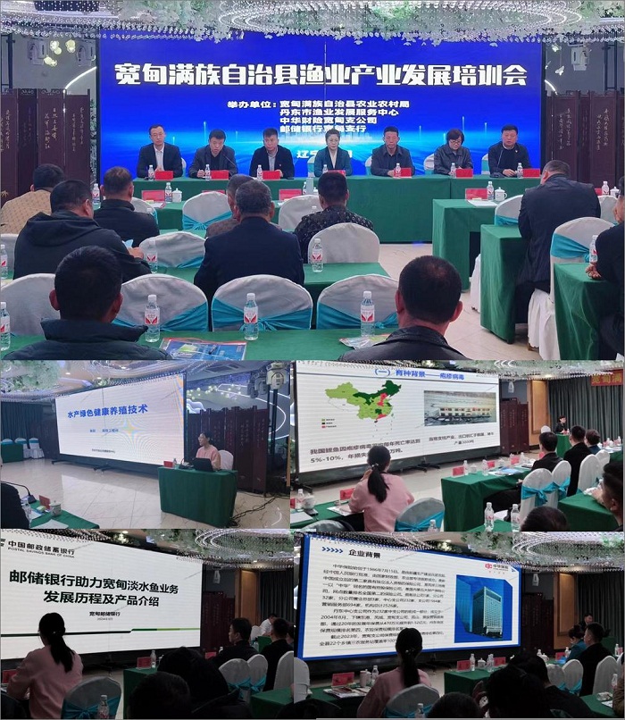 会上,中国水产科学研究院黑龙江水产研究所研究员、中心高级工程师、邮储银行和中华财险相关业务负责人分别就水产绿色健康养殖技术、渔业新品种的更新改良、金融资本助力产业融资、淡水鱼气象指数保险四个方面展开培训,与会人员进行了深入交流与探讨,对产业发展情况广泛交换了意见和建议。一是宣讲水产绿色健康养殖技术,推广大水面网箱生态养殖模式,指导养殖户病害防治、规范用药,保障水产品质量安全;二是介绍水产种业的发展,推动鱼类抗病新品种养殖。以镜鲤“龙科11号”为例,深入浅出地讲解了鱼类抗病新品种遗传育种的研究、养殖及推广应用情况;三是介绍邮储银行助力宽甸淡水鱼业务发展历程及最新贷款模式。详细推介了针对拥有不同养殖规模渔户开发的额度不同的贷款产品,如“渔担贷”等;四是提高养殖群体应对养殖中自然灾害、人身伤害等风险的意识,拓宽应对渠道。讲解风灾、泄洪、高温缺氧保险条款。