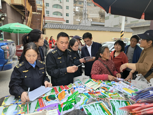 工作人员身着检疫制服,佩戴检疫标志,深入县城农资市场,向广大群众宣传植物检疫的重要性,广泛普及植物检疫相关法律法规,给种苗经营者细心指导农作物种苗产地、调入检疫程序。