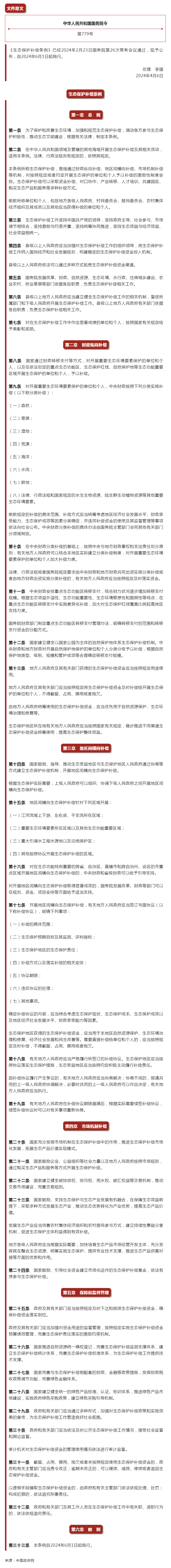 国务院总理李强日前签署国务院令,公布《生态保护补偿条例》(以下简称《条例》),自2024年6月1日起施行。