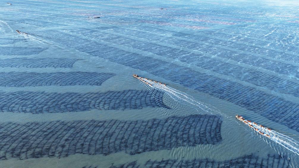 3月2日,在山东省荣成市爱伦湾海洋牧场,养殖工人驾驶着养殖船穿梭于海带养殖区(无人机照片)。新华社发(王福东摄)