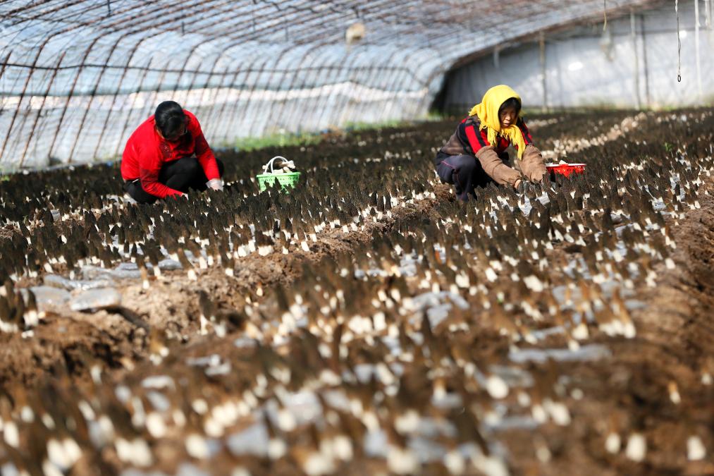 3月31日,在即墨区灵山街道的青岛大地欢歌果蔬专业合作社,农民在大棚里采收羊肚菌。新华社发(梁孝鹏摄)