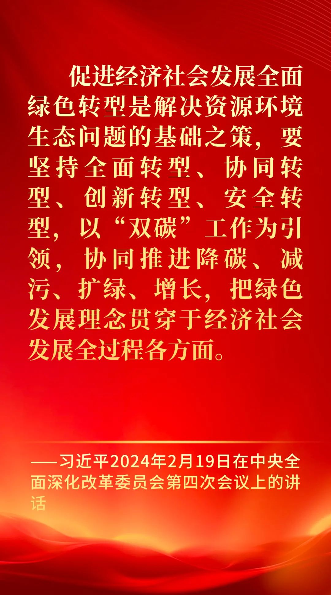 促进经济社会发展全面绿色转型是解决资源环境生态问题的基础之策,要坚持全面转型、协同转型、创新转型、安全转型,以“双碳”工作为引领,协同推进降碳、减污、扩绿、增长,把绿色发展理念贯穿于经济社会发展全过程各方面。
