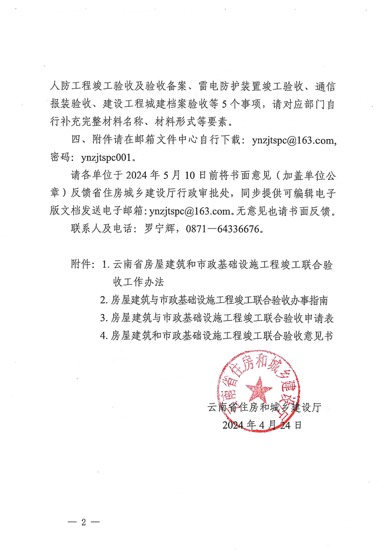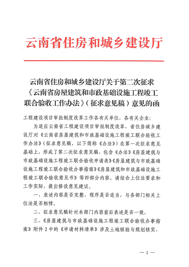 云南省住房和城乡建设厅关于第二次征求《云南省房屋建筑和市政基础设施工程竣工联合验收工作办法》(征求意见稿)意见的函