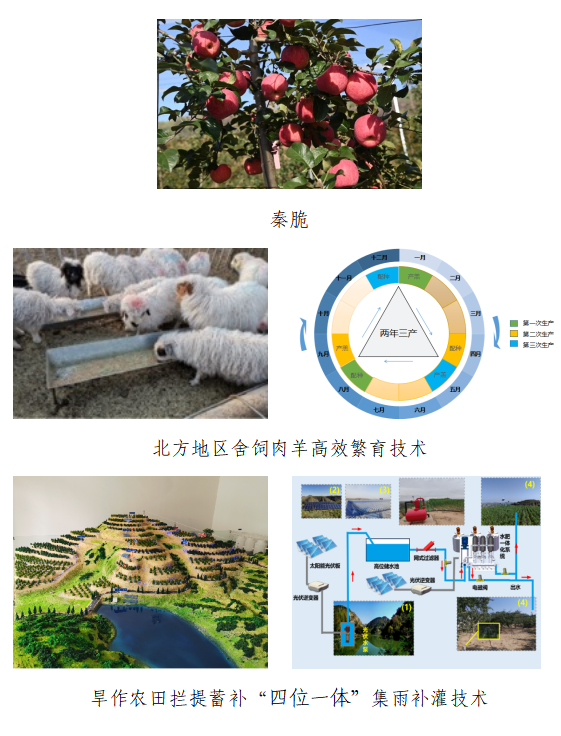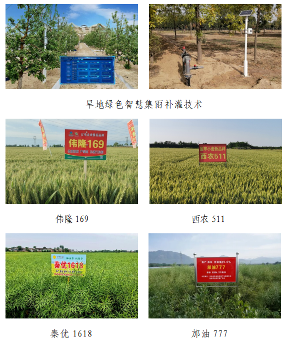 “旱地绿色智慧集雨补灌技术”成功入选10项农业重大引领性技术。“伟隆169”和“西农511”因其高产、抗病、抗倒、优质强筋及适宜区域广等诸多优点,再次入选17个小麦主导品种。油菜品种“秦优1618”和“邡油777”因其高产、高油、抗病、抗倒及适宜机械化等优势,再次入选15个油料主导品种。苹果品种“秦脆”以其单产高、抗逆性强、品质佳、丰产性强等特性,再次入选17个水果园艺主导品种。“北方地区舍饲肉羊高效繁育技术”成功入选15项畜牧类主推技术。“旱作农田拦提蓄补‘四位一体’集雨补灌技术”成功入选15项资源环境类主推技术。