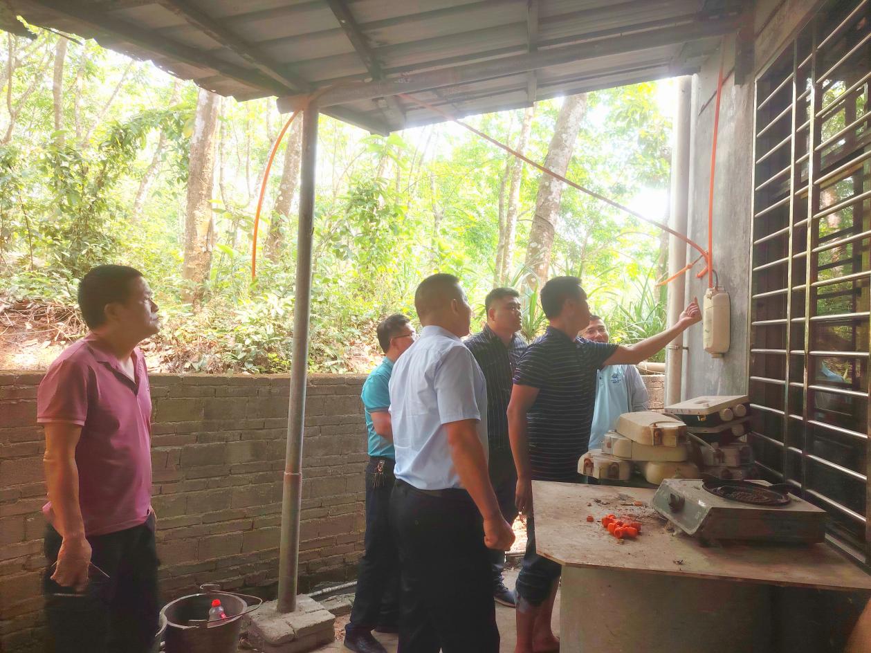 调研指导组来到位于儋州市桥南村的莫氏农业公司一处沼气工程检查,该沼气工程处于闲置状态,存在警示标志不清楚、设施设备老化等问题,调研指导组要求及时整改。随后,来到南丰镇那王村一处户用沼气,该户用沼气目前仍在使用且正常产气,调研指导组对重点部位,重要环节逐项进行检查,该户用沼气各项措施基本符合安全生产要求。