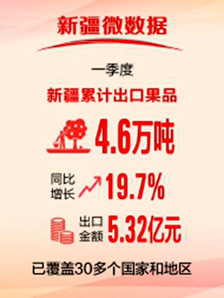 乌鲁木齐4月29日讯 石榴云/新疆日报记者曹华报道:海关总署海关统计数据查询平台显示,一季度,新疆累计出口果品4.6万吨,同比增长19.7%,出口金额5.32亿元。