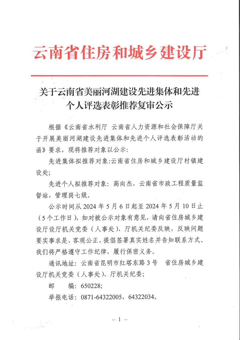 关于云南省美丽河湖建设先进集体和先进个人评选表彰初审通过对象公示