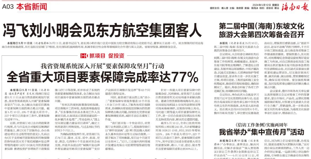 截至5月10日,全省已批农用地转用和土地征收241宗,共计新增建设用地1826.21公顷,同比2023年增长123%。295个省重大项目中,227个项目已具备开工条件,要素保障完成率77%,其中定安已完成全部省重大项目的要素保障,海口、三亚、澄迈、陵水等市县要素保障完成率达到80%以上。