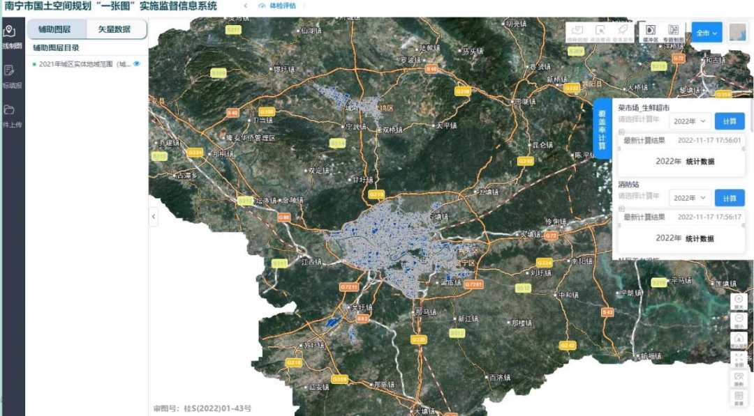 机制规范化,服务国土空间规划城市体检评估。南宁市在国土空间规划“一张图”实施监督信息系统中专门搭建城市体检评估模块,将城区范围确定成果作为国土空间规划城市体检评估工作的统计底图,横向发送给相关市直部门。对应国土空间规划城市体检评估指标体系中统计范围为“城区”的指标项,建立起“常态统计—定期更新—动态反馈—即时查询—部门共享”的数据对接和监测评估机制,实现数据实时动态采集更新。
