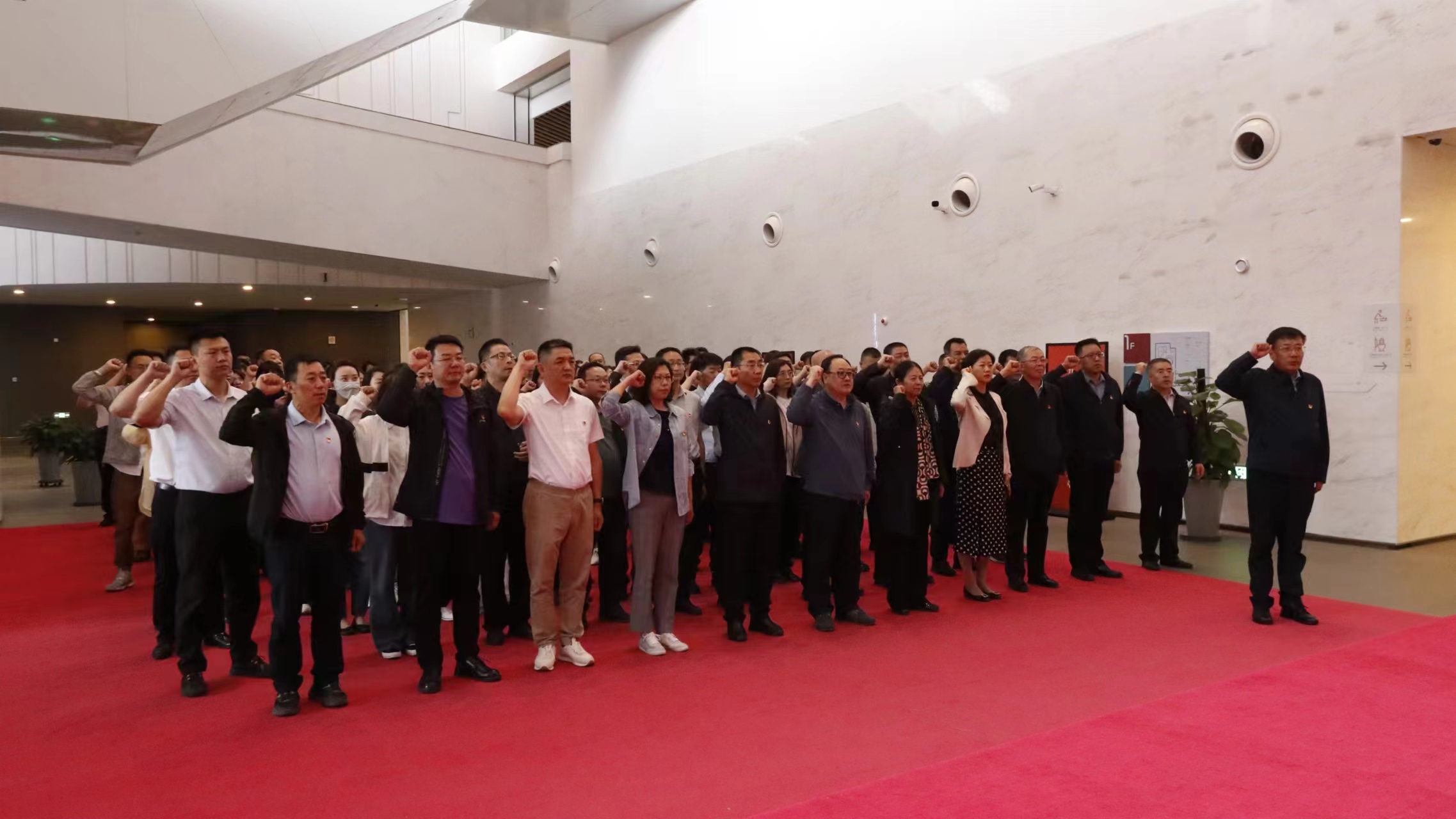 在展馆大厅,赵大勇带领全体党员举起右拳,面对党旗重温入党誓词。铮铮誓言久久回荡,是信仰的力量,更是奋斗的宣言。随后,大家依次参观了本次主题书画展近200件展品,这些展品以艺术形式书写和描绘了全区各族群众在长期生产生活中交往交流交融以及手足情深、守望相助的美好景象,大家时不时地停驻在展品前,畅谈感受。