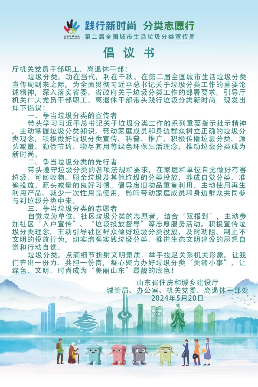 2024年5月22日-28日,是第二届全国城市生活垃圾分类宣传周,主题是“践行新时尚,分类志愿行”。为深入贯彻习近平总书记关于垃圾分类重要论述精神,落实全国城市生活垃圾分类现场会精神,5月24日,省住房城乡建设厅在济南市举办山东省第二届城市生活垃圾分类宣传周启动仪式,旨在丰富垃圾分类宣传形式,普及垃圾分类重要意义,进一步激发群众参与垃圾分类的积极性、主动性,引导群众践行绿色生活方式,提升群众对垃圾分类的认同度和参与度,让全民参与垃圾分类的社会氛围更浓厚!省住房城乡建设厅厅长王玉志,党组成员、副厅长(正厅级)侯晓滨出席活动,济南市委常委、副市长任庆虎致辞。