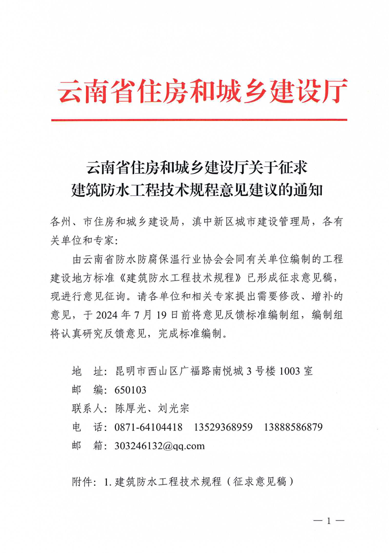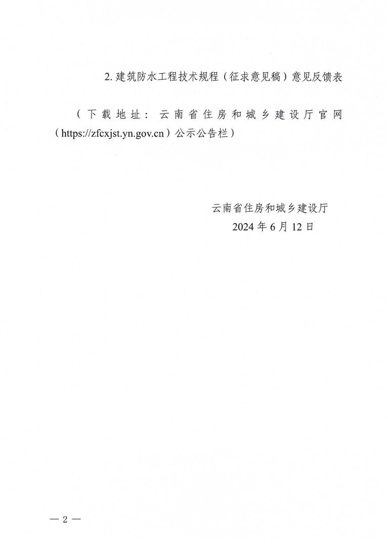 云南省住房和城乡建设厅关于征求建筑防水工程技术规程意见建议的通知
