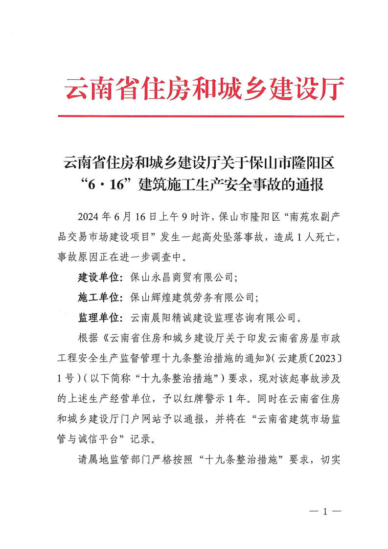 云南省住房和城乡建设厅关于保山市隆阳区“6.16”建筑施工生产安全事故的通报