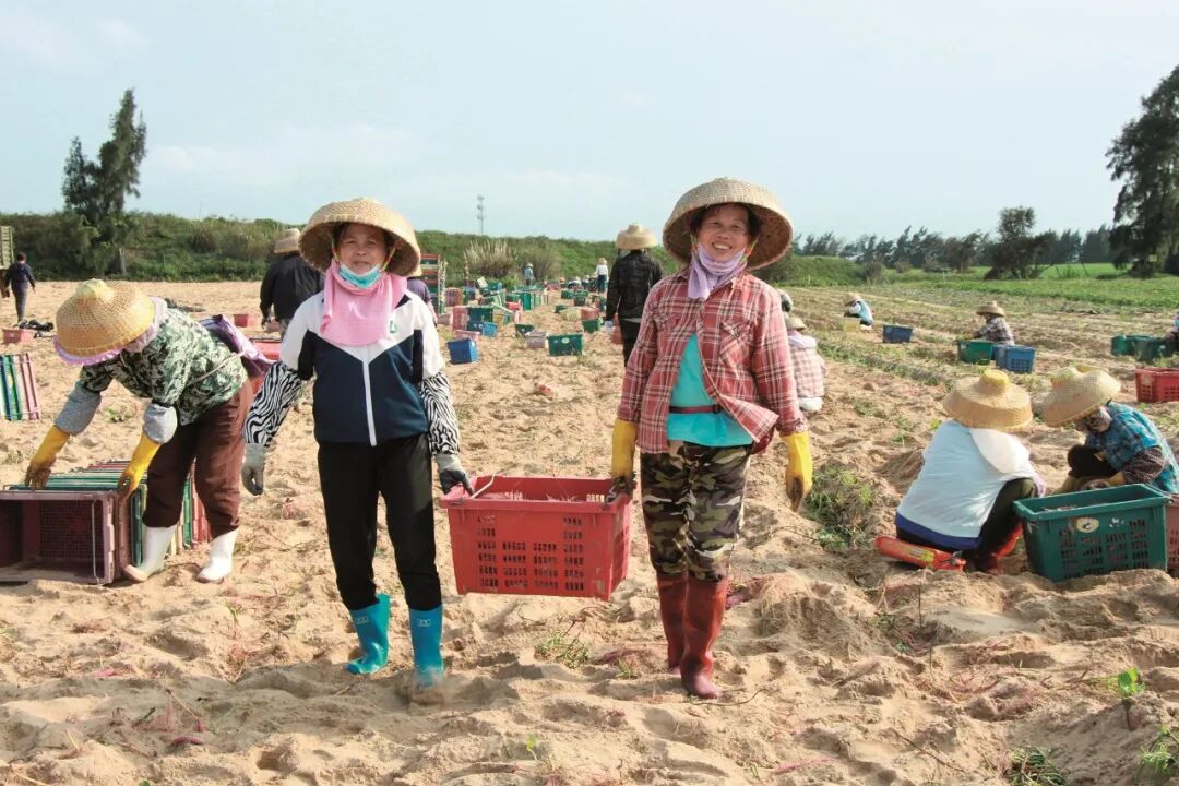 3月,文昌市铺前镇林梧村已进入板栗地瓜的收获季节。在文昌市木兰湾生态农业科技有限公司的基地里,高大的地瓜收割机在整齐的田垄间来回逡巡,20多个人则跟在收割机后忙着采收地瓜。村民潘荣华一边从沙地里把一个个紫红色的地瓜放进身边的筐子,一边美滋滋地告诉记者:“我们按照一小时20元钱算工资,我一天能挣160元,挺知足呢。”林梧村板栗地瓜进入收获季节,在板栗地瓜基地负责收地瓜的村民每天能挣到160元工资。高伟民/摄