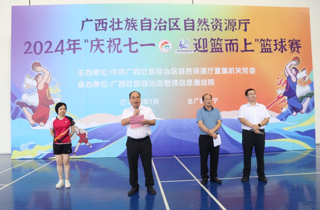 7月1日晚,由自治区自然资源厅机关党委主办、广西地理信息测绘院承办的2024年“庆祝七一 ‘迎篮’而上”篮球赛在南宁开幕。厅党组成员、副厅长郑杰忠出席开幕式并致辞。
