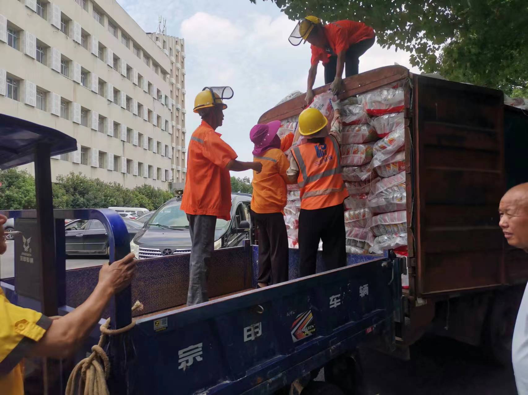 在免费种子发放现场,共青城市农业农村水利局院内停着一辆装载数万斤救灾种子的货车。农户们顶着酷热,有序地从车上卸下一袋袋种子,而工作人员则在旁进行种子数量的核对工作。
