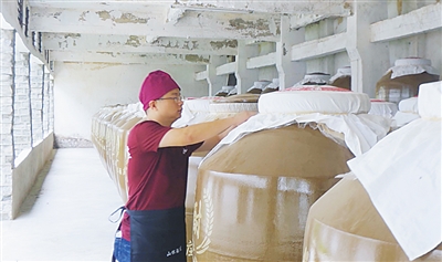 所谓大罐发酵,费雪忠介绍称,就是把蒸好的米和酒曲混合后放入不锈钢发酵缸中,经过24小时的糖化产生浆液,再加水进行敞缸发酵。发酵时,每隔一段时间要进行一次“开耙”,即搅拌冷却,调节发酵的温度,补充新鲜空气,以利于酵母生长繁殖。“发酵环节,我们必须24小时待命,每两小时检查一次。”费雪忠说,这个过程很磨人,有时大家困得不得了,想摁掉闹钟继续睡,但最终一起咬牙坚持下来。